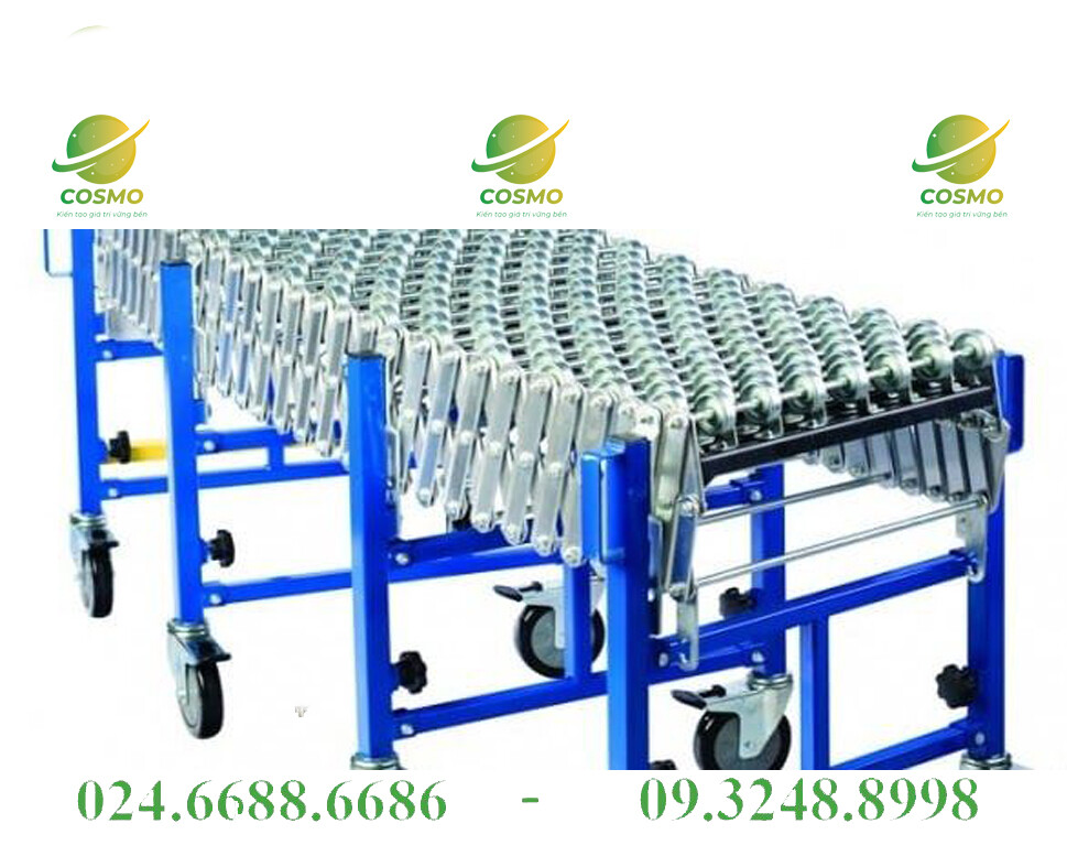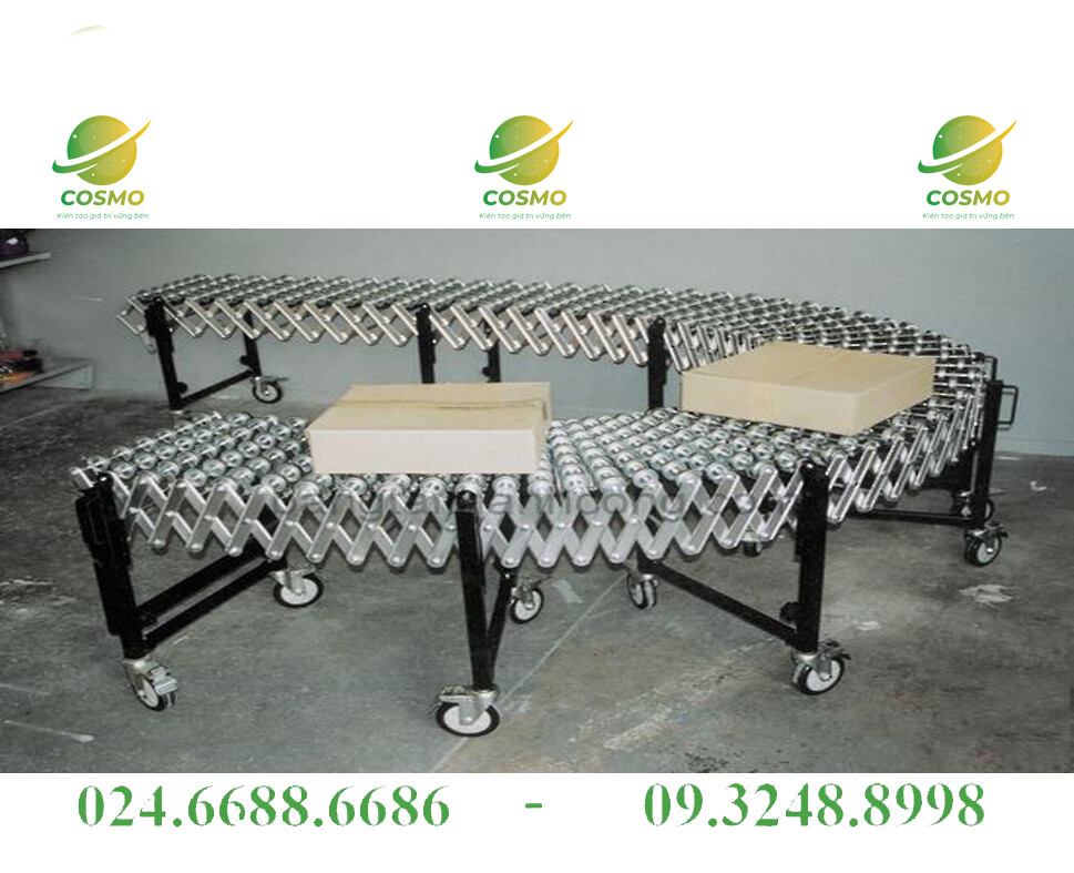 – Băng tải con lăn xếp thường được đặt trên các container, xe tải để tiện lợi trong quá trình xuất hàng dựa vào tính kéo giản của hệ thống khung.
