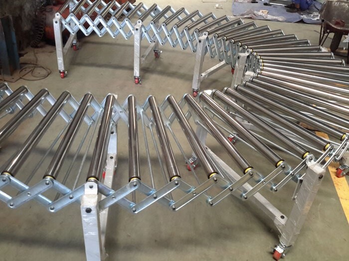 - Băng tải con lăn xếp thường được đặt trên các container, xe tải để tiện lợi trong quá trình xuất hàng dựa vào tính kéo giản của hệ thống khung.